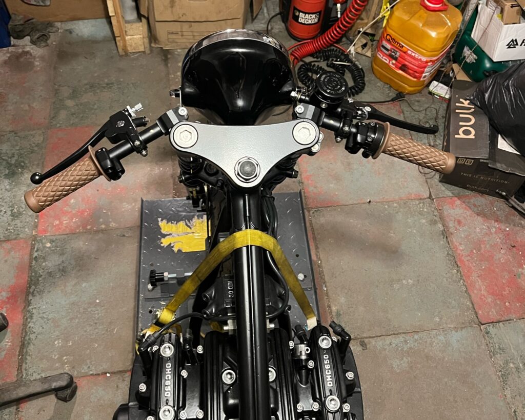 Georg and I met at a friend’s party back in 2023. Georg had heard from one of the guys that I was a motorcycle mechanic, and we quickly struck up a conversation about a CB 650 from 1980 that he had sitting in his garage. It was a project he had started with a friend, but unfortunately, it had come to a halt. After a lot of talk about dreams and cool ideas for a cafe racer, we decided that we would completely rebuild it to match Georgs vision, a design very similar to something I’d build for myself. We’re talking a fuel tank in British racing green, gold pinstriping, a custom seat with diamond stitching in brown leather with matching grips, champagne colored wheels, and as minimalist a wiring system as possible, without compromising safety or functionality.