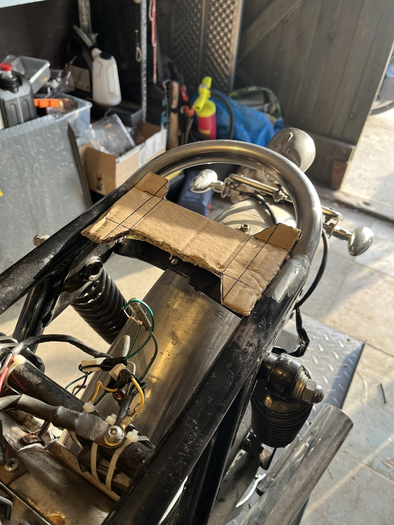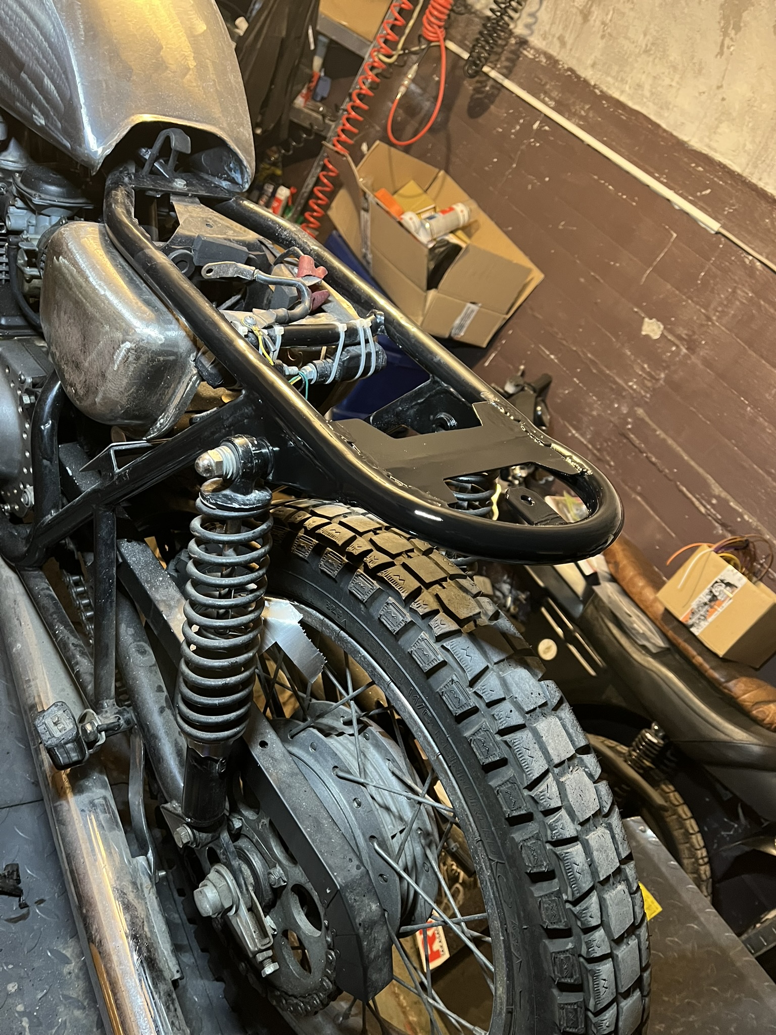Step three: i drew a new design of the back end of the chassis (loop/hoop) and travers. and got some exhausts under the legal noise limit. This was a necessity to be able to get an approval and register the bike and its modifications legally in Denmark